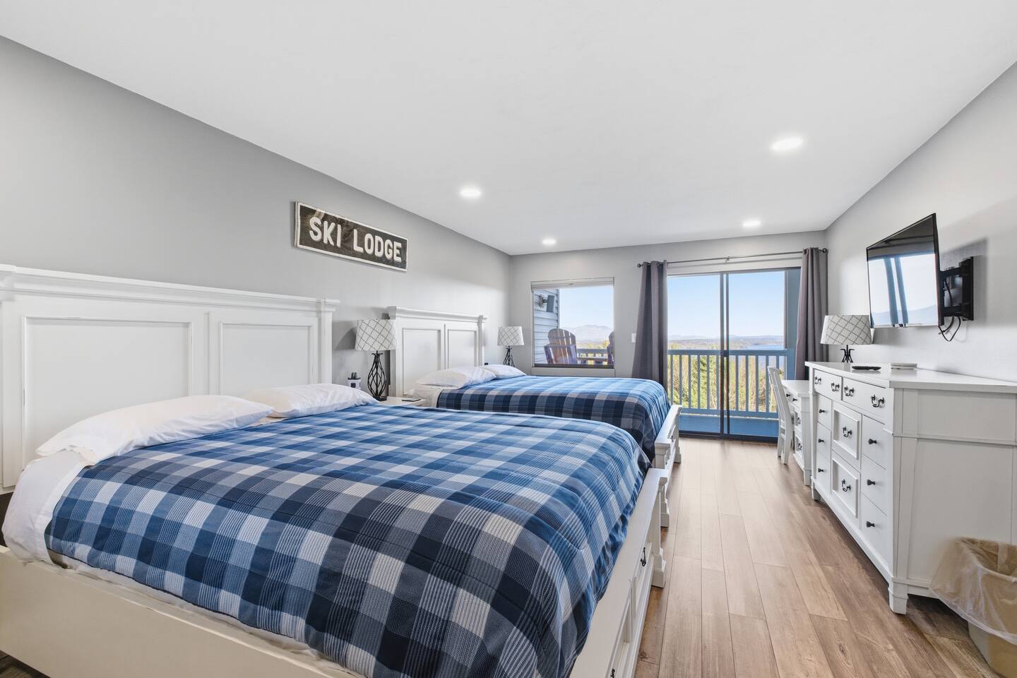 This spacious, well-designed condo features an open concept layout with a full kitchen equipped with all the essentials for preparing home cooked meals. A high-top dining table comfortably seats four. The inviting living area includes a pull out sofa, providing additional sleeping space for guests. Each room is equipped with a smart TV for your entertainment. The condo offers two full bathrooms one with a walk-in shower and the other with a tub/shower combination. Connected to the main living area is a large, hotel-style bedroom featuring two queen beds and access to an expansive balcony that spans the length of the condo and overlooks beautiful Lake Winnipesaukee. The balcony is furnished with high-top Adirondack chairs perfect for relaxing and taking in the lake views. Meals and Rentals License # 105468